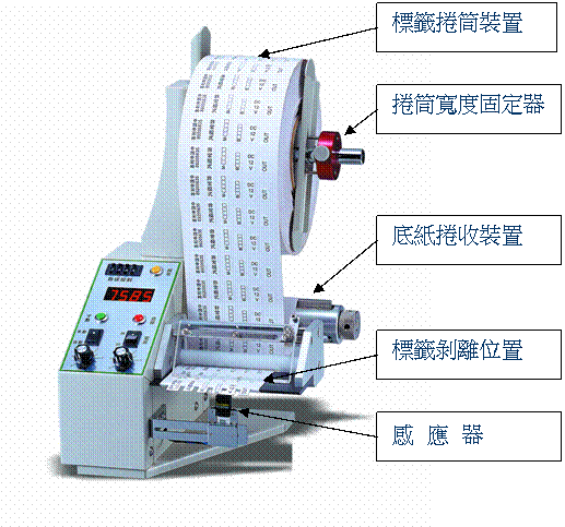 二、 操作說明 A. 單張剝標模式: 本模式適合單張標籤剝離取用,每撕取一張標籤離開感應器後,下張標籤將依設定的標籤長度,停留於適當位置,等待撕取。 1. 將標籤捲筒置於捲筒裝置,並適當夾妥,避免晃動。 2. 將標籤穿過剝離區並捲夾於底紙捲收位置。 3. 操作模式:【AUTO】 4. 工作模式:【MODEL1】 5. 開啟電源 6. 調整標籤長度旋鈕LENGTH 7. 調整標籤速度旋鈕SPEED ※ 注意:本模式下無缺紙警報功能。 ※ 本模式亦適用於透明標籤。 B. 多張剝標模式: 本模式適合一列多張標籤,當感應器上最後一張標籤被撕取後,下列標籤將依設定的標籤長度,停留於適當位置,等待逐一撕取。 1. 將標籤捲筒置於捲筒裝置,並適當夾妥,避免晃動。 2. 將標籤穿過剝離區並捲夾於底紙捲收位置。 3. 操作模式:【AUTO】 4. 工作模式:【MODEL2】 5. 開啟電源 6. 調整標籤長度旋鈕LENGTH 7. 調整標籤速度旋鈕SPEED ※注意:本模式下若缺紙長達10秒,將發出蜂鳴警報,直到重新裝紙完成,按下【STOP】按鈕,即可恢復操作,並取消警報。 C. 底紙捲收器操作 1. 操作模式【MENU】 2. 按著【INCH】,底紙捲收器捲動。 ※ 注意:機器後方有底紙捲收器正(逆時針)、反(順時針)向控制,運轉時請選擇正向。 三、 注意事項 A. 搬動時切勿抓握捲筒裝置或底紙捲收器,應托住主機本體搬動。 B. 無論何時,不可手動轉動底紙捲收器。 C. 操作發生異常時,立即按下【STOP】,即可停止操作。 D. 標籤剝離過程中可能產生靜電現象,屬正常現象。